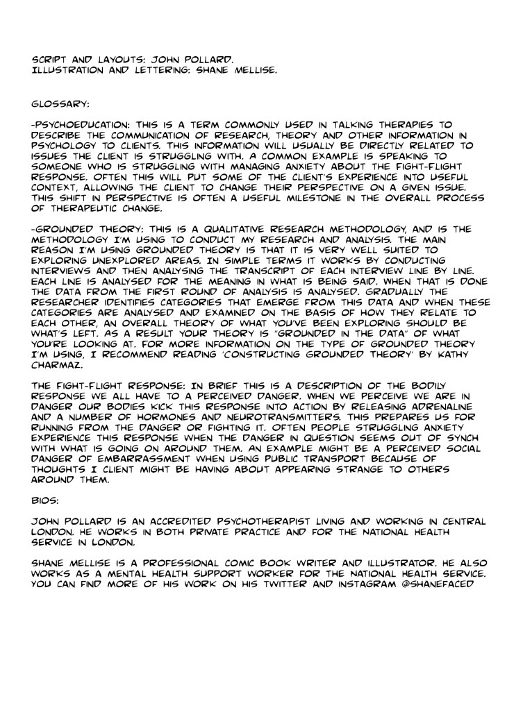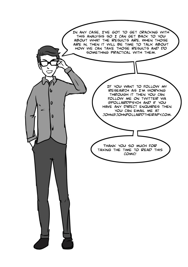 I actually spent quite a lot of time developing this topic, but leaving it out made the thesis more coherent. That wasn’t an easy decision because I think using sequential art as a medium for engaging with the public as a psychologist is very important. For clarity’s sake though, focusing solely on clinical application made sense.
